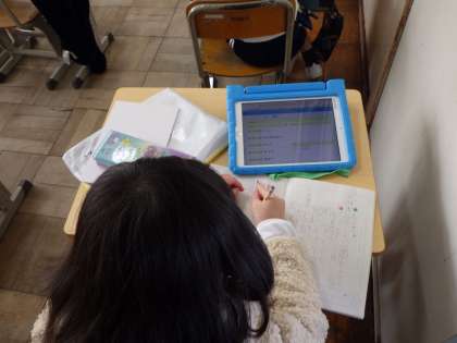 教室に入ると荷物を片づけ、連絡帳に明日の連絡を書きます。その際には、タブレットの連絡掲示板を活用しています。これまでは黒板に書かれた予定をノートに書き写していましたが、いつタブレットを持ち帰ってのオンライン授業や連絡になってもいいようにしています。