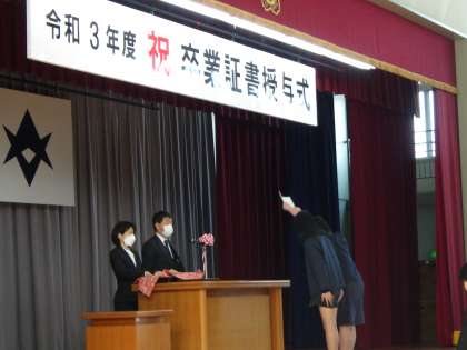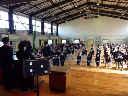 卒業式当日は学年休業日で参加できない4年生と5年生が保護者席に座って参加しました。また、様子をライブ配信し、1年生から3年生までも視聴できるようにしました。
