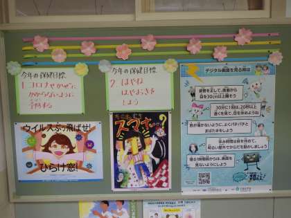 今年度の保健目標は 公開日 2022/04/19 更新日 2022/04/19 お知らせ 保健室の入り口横にある掲示板に、今年度の保健目標が掲げられています。 1 コロナや風邪にかからないように予防する 2 早寝・早起きをしよう この2つの目標を達成するために、委員会活動や検診時の保健指導を進めていきます。