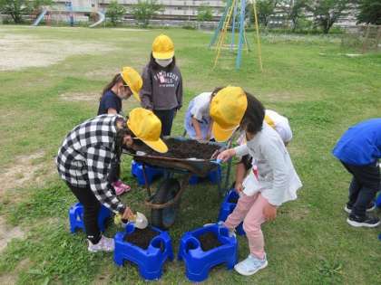 1年生は生活科であさがおを育てます。今日は、第一歩となる種まきをしました。植木鉢にやさしく土を入れ、肥料をまぜてふかふかのベッドをつくりました。「大きくなってね」「きれいな花を咲かせてね」願いをこめて、ふかふかのベッドに種をまきました。午後からの雨が、恵みの雨となりますように・・・。