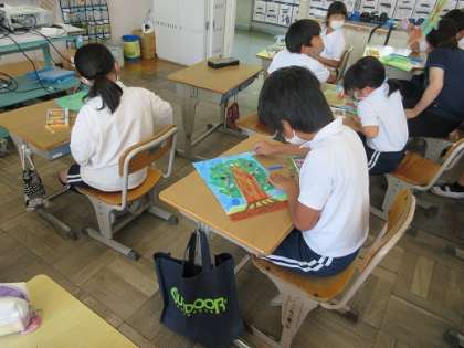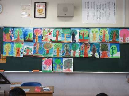 3年生が、絵の具で彩色した絵に、さらにクレヨンや色鉛筆で色を重ねて「カラフルマイツリー」を仕上げていました。その出来栄えは・・ゴッホ?ゴーギャン?ルノワール?黒板に掲示された作品の数々。教室が素敵なギャラリーになっていました。