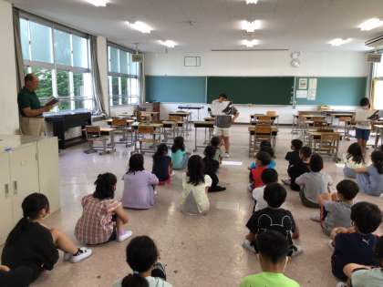 今日は朝から蒸し暑く、朝8時30分の時点でWBGT(暑さ指数)が危険領域にあたる31を超えてしまいました。これを超えると外での活動は原則禁止です。今日予定していたやまびこ遊びも、外遊びも、水泳の学習も、今日はできません。子どもたちの「残念…」と言う声が聞こえてくるようです。