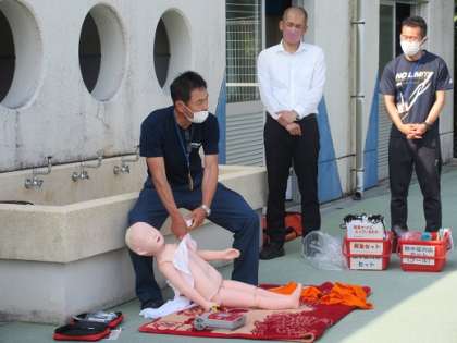 各学年のプールびらきが終わり、水泳授業が本格的に始まりました。私たち教職員にとっても久しぶりのプール指導になります。安全第一を心がけて指導していますが、もしもの時の対応について、消防署の救命救急士を講師にお招きし研修をしました。