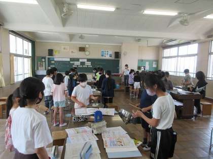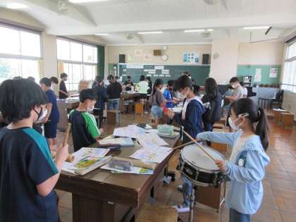 5年生が打楽器を使って、グループごとにリズムをつくって練習していました。