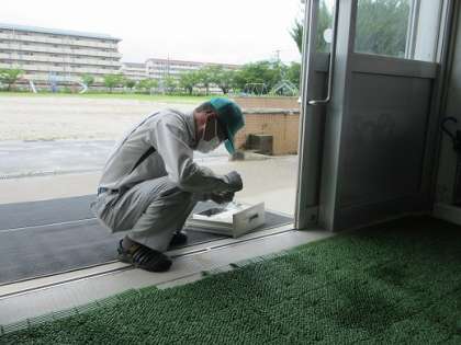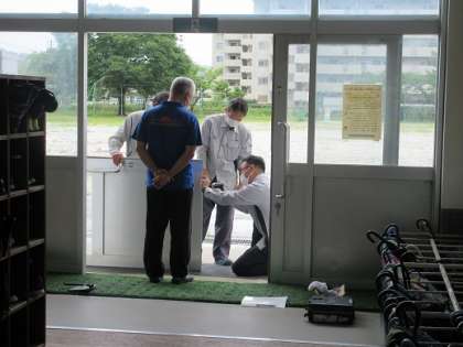 左の写真は校内整備員さんです。校地内の草刈りをしたり、壊れた箇所の修繕をしてくださっています。今日は、昇降口の扉の不具合をなおしてくださっていました。