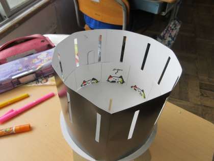 その絵を黒い筒状のもの(ゾートロープ)に入れて、筒を回転させ、隙間から覗いてみると・・
