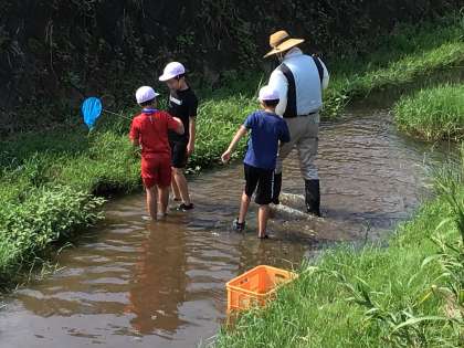 網を片手に魚やザリガニを捕まえることで、岩本川に住む生物を調査したり、川幅と深さ、流れの速さの違いを調査したりと、2年生の時とは少し異なった視点で岩本川探検を楽しみました。