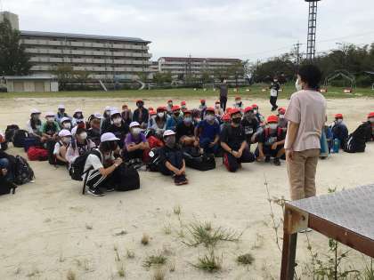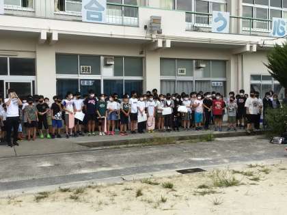 グランドでは出発式が行われています。児童代表のお話先生のお話を聞いてさぁ出発!と思ったら他学年からの見送りがありました。