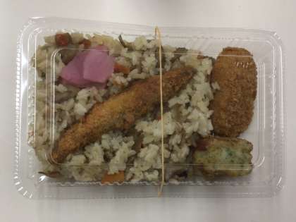 炊き込みご飯にししゃもフライとちくわ天、コロッケが載っていました。