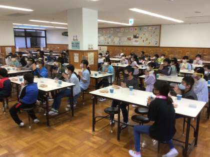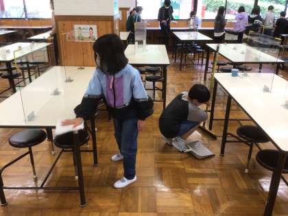 「ごちそうさま」をして片付けた後、食事係の皆さんが机を拭いたり床を掃いたりしていたことも付け加えておきます。係の仕事を全うできましたね。