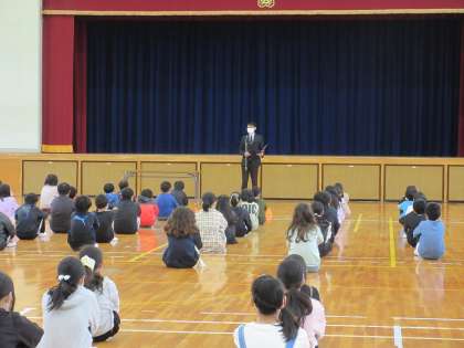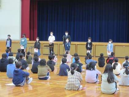 とは言っても、全校児童を体育館に集めることは難しく、1〜3年と4〜6年に分かれての終業式でした。