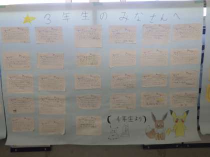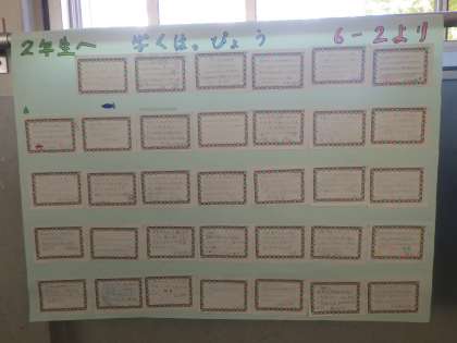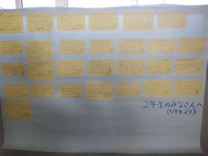 今日の朝には、高学年から各学年へメッセージの書かれた掲示物が廊下のいたるところに貼られていました。