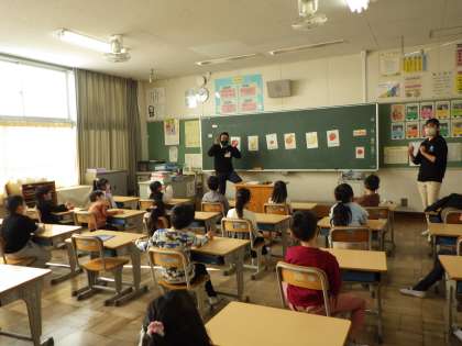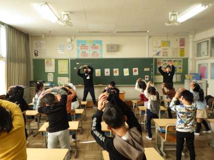 フルーツを英語で表現しながら、体でもポーズをとって表現します。ポーズは子どもたちのアイデアから決めていました。だからか、大盛り上がりです。