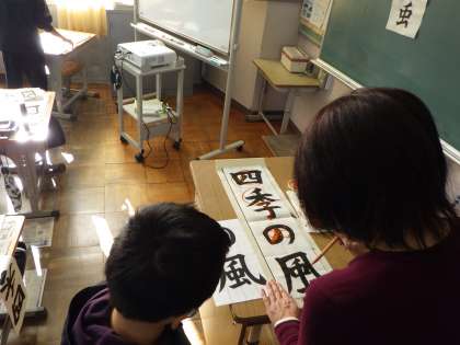 毎年、市の書道連盟から講師の方がボランティアで教えてくれます。今年度は2名の先生が来てくれました。