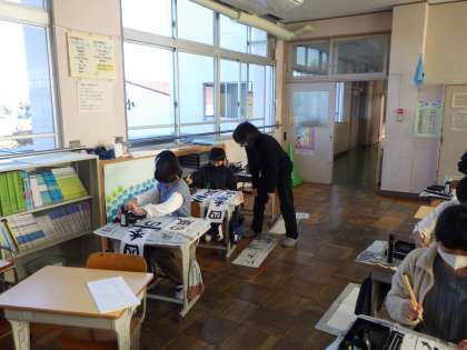 3年生から6年生までが各学級2回ずつ行う予定で今日から始まりました。今日は、3年生と5年生の日です。筆の入りや紙のどの位置で収めるかなど細かく丁寧に教えてくれます。また、書き始めると一人一人にアドバイスもいただけます。