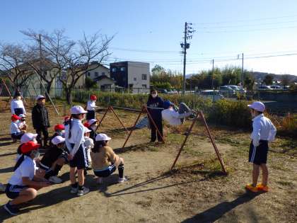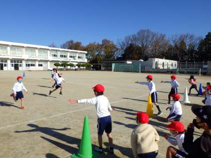 体育の授業では、1組は運動場で「かけっこあそび」を、2組は体育館で「たからとりおに」を、3組は運動場で「てつぼうあそび」に取り組んでいました。