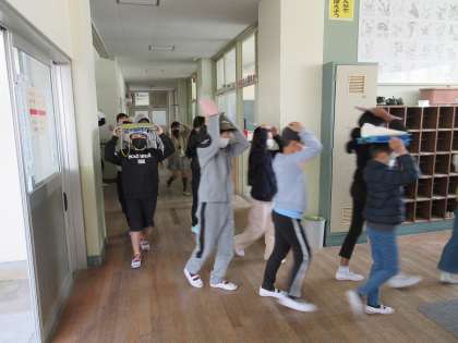 これまでの授業時間内の訓練では、教師の指示に従って避難していましたが、今回は、休み時間なので、自分で考えて、自分の身を守ることを訓練しました。