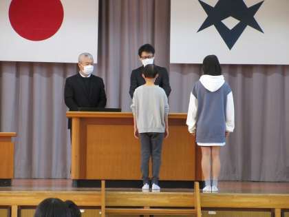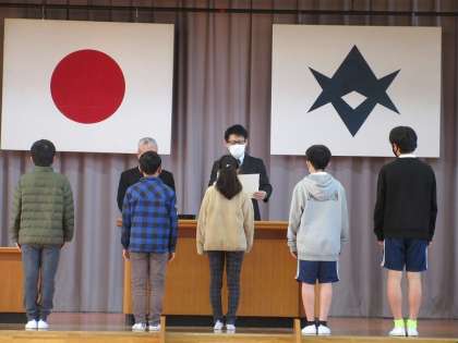 皆勤賞は、小学校入学から本日まで授業日に休みなく登校することができたことを、ねれかて学校賞は、手本となる善行を称え授与されるものです。