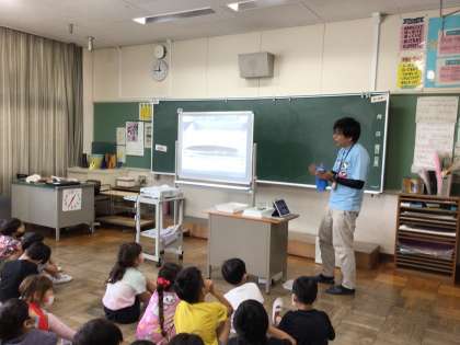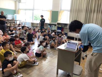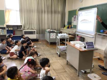 岩本川から学校へ戻った2年生の子どもたちは、矢作川研究所の生きもの博士から岩本川の生きもののお話を聞きました。水質のいい岩本川にはたくさんの生きものが棲んでいます。中でも、子どもたちの興味をひいたのは岩本川に棲む3種類のドジョウ「ドジョウ3兄弟」です。実際にドジョウを見ながら3種類のドジョウの特徴を教えていただきました。