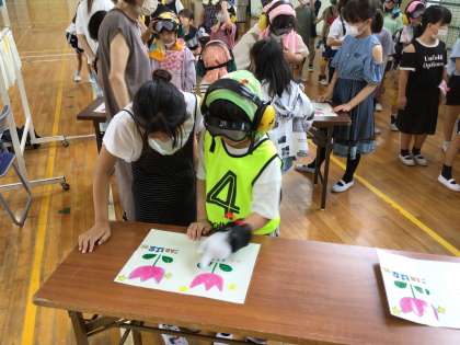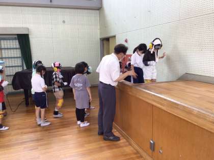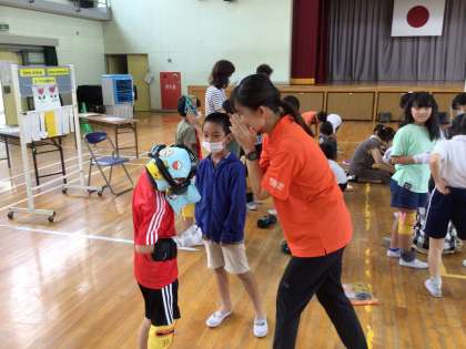 3年生の総合的な学習で「福祉実践教室」がありました。膝にサポーターを付けたり、足におもりを付けたり、ゴーグルやイヤーマフを付けたりしながら「高齢者疑似体験」を行いました。ペアで体験者と介助者を決め、思いやりをもってペアの友達に声掛けをしながら、階段の昇り降りやゴーグルをして文字を見る体験をしました。