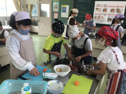 5年生がキャンプのカレー作りの練習として、ゆで野菜のサラダを作りました。