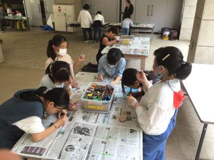 木を切って作った板の表面を磨き、絵を描いて安全ピンをつけて完成です。