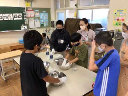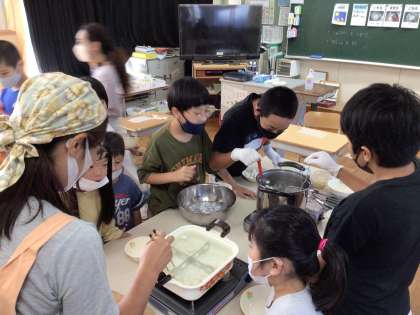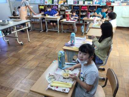 9月29日、1時間目に7、8組でお月見だんごを作りました。こねる→まるめる→ゆでる→ひやす→もりつけるなど、子どもたちは自分で確認しながら作りました。自分が作ったおだんごは、自分で好みの味付けをして食べることができました。今日の天気は晴れ。きれいな十五夜お月様が見えることでしょう。