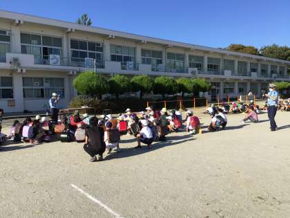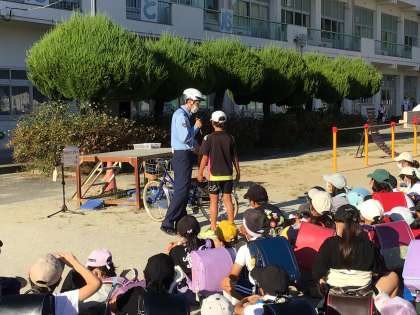9月29日の3年生〜6年生の下校時に、豊田警察署の方に来ていただき、交通安全について指導していただきました。特に自転車の安全な乗り方についてお話していただきました。ヘルメットは必ずかぶること、自転車に乗るときは左側から乗ることなど、実際に見ながら説明してもらいました。これからも命を守るために、交通安全に気をつけて、自転車に乗りましょう。