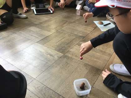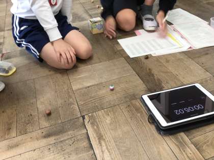 やまびこの森で拾って作った自分のどんぐりごまを持ち寄り、やまびこ班ごとに分かれて、長生きごまの練習をしました。1秒でも長く回るように願いをこめてどんぐりごまを回す子どもたちの姿が印象的でした。休み時間にどんぐりごま練習をする子どもたちもいます。