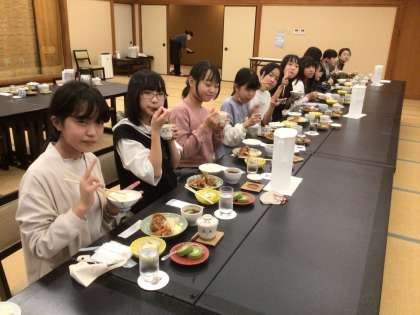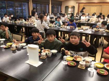 旅館の夕飯の時間がやってきました。昼食の時間が早かったため、子どもたちはお腹がぺこぺこ。ご飯はおかわり自由ということで、すぐにおかわりの列ができました。夕飯を食べ終わった子どもたちは「おいしかった」「お腹いっぱい」と笑顔。友達と食べる夕飯は格別ですね。