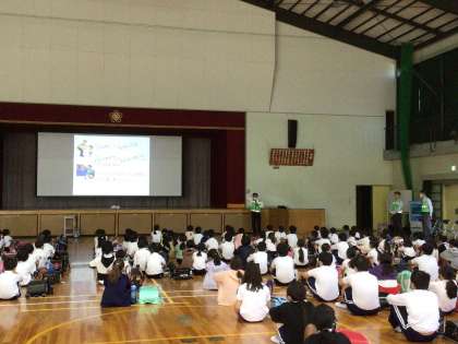 10月17日3時間目に、2、3、4年生を対象に「子どもの防犯教室」が行われました。自分の身を守るために、「つみきおに」にかけて「ついていかない」「みんなといつもいっしょ」「きちんと知らせる」「おおごえで助けをよぶ」「にげる」の大切な5つを交通安全防犯課の方々に教えていただきました。不審者への対応の仕方を教えていただいたり、大声を実際に出してみたり、防犯ブザーの使い方について学んだりすることができました。