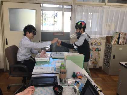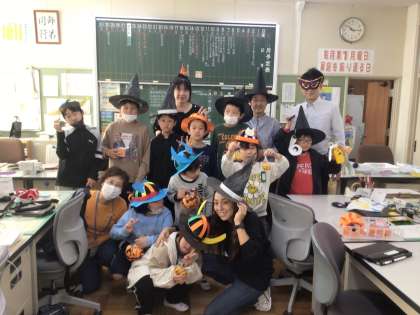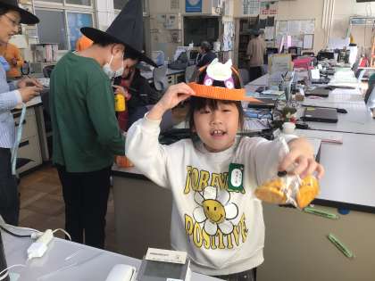 7、8組の子どもたちがハロウインの仮装をして職員室へやって来ました。同じく仮装している校長先生や教頭先生を見つけ、「Trick or Treat」の合言葉。先生の目を見て上手に言うことができ、カボチャクッキーを嬉しそうに受け取っていました。