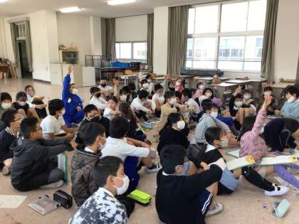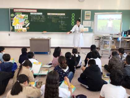 4年生が給食の材料に豊田市で生産されたものが多く使われていることを調べ、なぜ給食には豊田市の食材が多く使われているのか栄養教諭に話を聞きました。栄耀教諭からは「地産地食」の説明がされ、実際に給食のお米や小麦を作っている農家の方のインタビュー映像を見せていただきました。