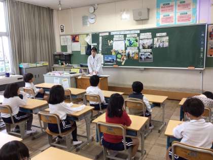 1年生の学級活動で、栄養教諭の岡野先生に栄養指導をしていただきました。「給食は誰が作っているのかな」というテーマでしたが、給食をつくってくれている方の苦労や思いを知り、感謝して食べようという気持ちをもつことができました。これからも、食事を作ってくれた方々に感謝の気持ちをもって、残さず食べてくれることでしょう。