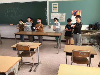 2年生が1年生におもちゃの作り方と遊び方を教えました。ゴムロケットやぴょんぴょんがえるなど簡単に作れるおもちゃの作り方を1年生に分かりやすく、優しく教える2年生は頼もしく見えました。