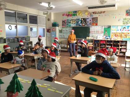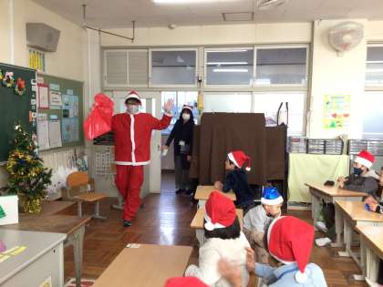 7 8組でクリスマス会をしました。「あわてんぼうのサンタクロース」の歌を歌っていると、サンタさんが7 8組のみなさんのところへやって来ました。