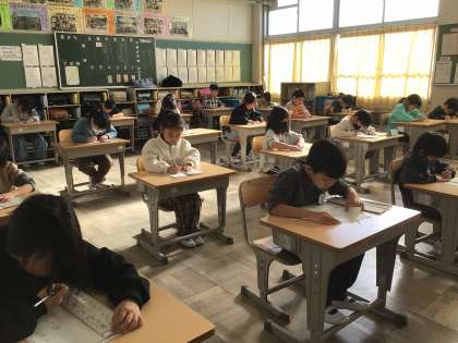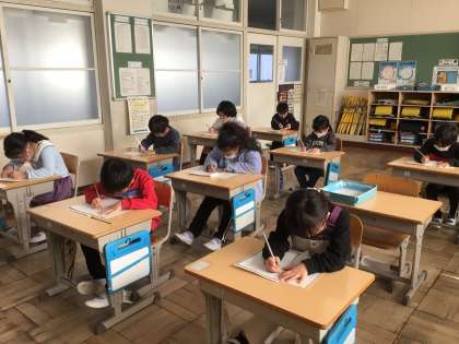 集中力と緊張感がはりつめた教室で、一文字一文字に思いをこめ、真剣な表情で取り組む子どもたち。