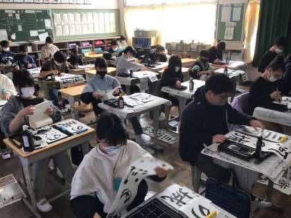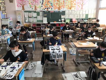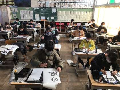 静まり返った教室で、お手本をよく見ながら真剣な表情で書いています。