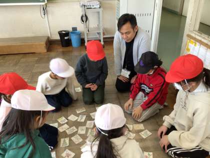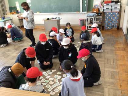 やまびこプチカルタ大会を行いました。赤白の各班で低学年と高学年に分かれて取ったカルタの枚数を競います。手を膝におき、読み札が読まれるのを待っている子どもたちの表情は真剣そのもの。緊張感に包まれた教室で、カルタを取るたびに歓声や悔しがる声が上がりました。