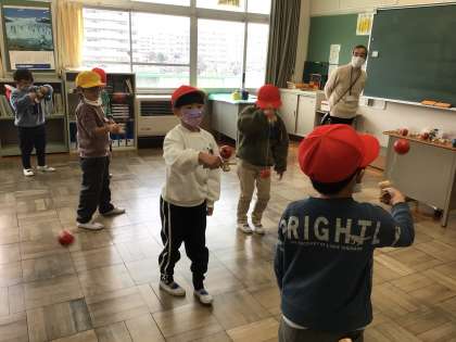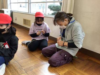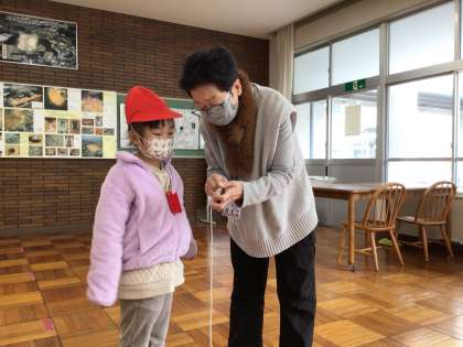 1年生が地域の方に、あやとり、おはじき、お手玉、けん玉、こま回しを教えていただきました。こまのひもの巻き方やおはじきあそびのルールなどを丁寧に教えていただき、子どもたちは楽しく遊ぶことができました。「こまが回った」「けん玉、のったよ」と嬉しそうな声があちこちで聞こえました。