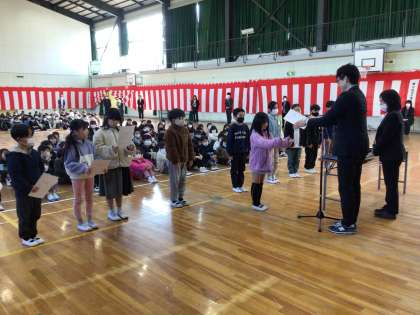 令和5年度修了式を体育館で行いました。校長先生から修了認定を受け、ねれかて学校賞の表彰、校長先生のお話、春休みの生活についてのお話を聞きました。話を聞く姿、起立や礼の姿勢から1年間の成長が見える修了式となりました。