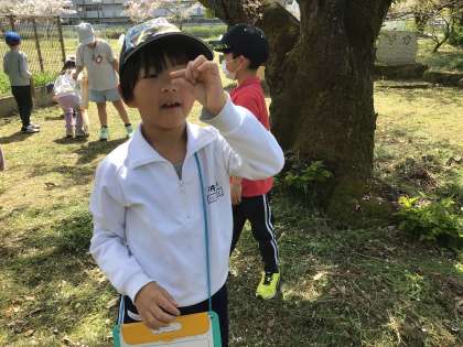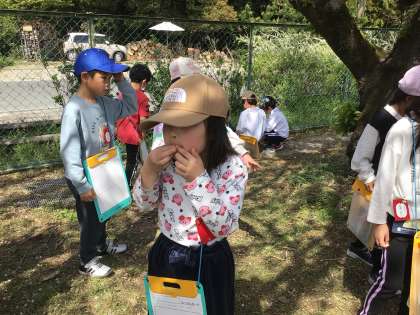 2年生が生活科の学習で校庭の春を見つけに行きました。桜やタンポポ、カラスノエンドウなどを見つけて、触ったり、匂いを嗅いだり、五感を使って春見つけをしました。