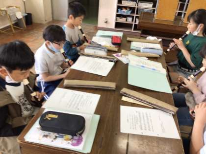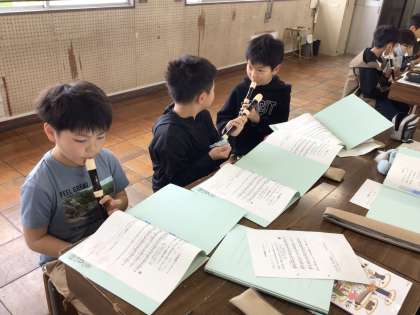 4年音楽 公開日 2024/04/24 更新日 2024/04/24 各学年から 4年音楽では、「小さな世界」をうたったり、「アチャ パチャ ノチャ」をリコーダーで吹いたりしています。運指を確認する練習タイムも夢中になって取り組んでいました。
