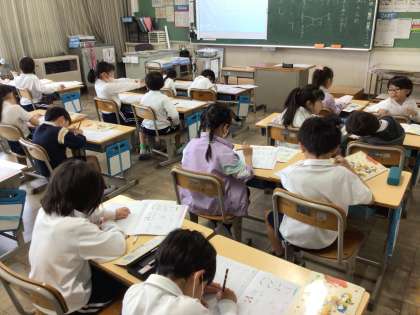 4月24日の2年生書写の「点と画の名前を覚えよう」では、「よこかく、たてかく、点、おれ、右はらい、左はらい、まがり、そり」を覚え、漢字の画がどれにあたるか考え、書くことができました。