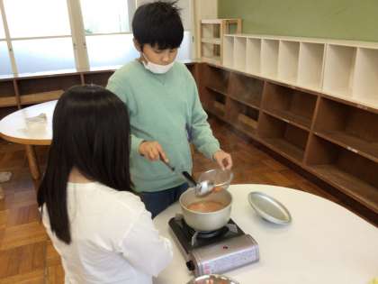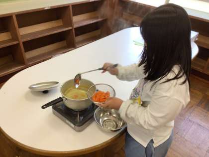 7、8組の6年生と、5年生の家庭科で、調理の手順を学習しました。「ゆでる調理をしよう」では、にんじんや、たけのこを上手に切ってゆでることができました。