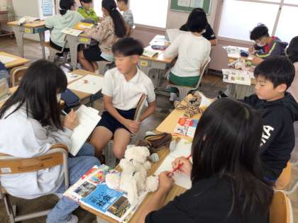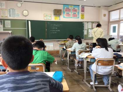 6年社会では、学習のめあてに対して自分なりの考えをノートに書いたあと、グループで意見交換をしていました。