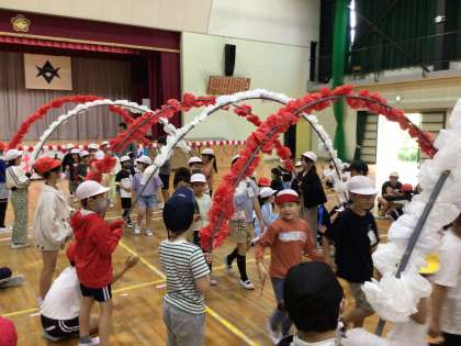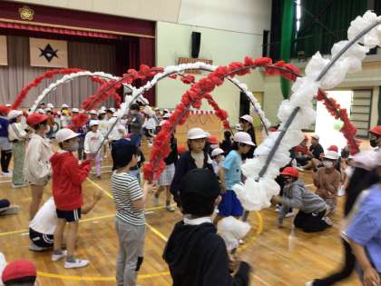 3年生の誘導で1年生が退場します。アーチは4年生が準備してくれました。