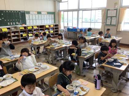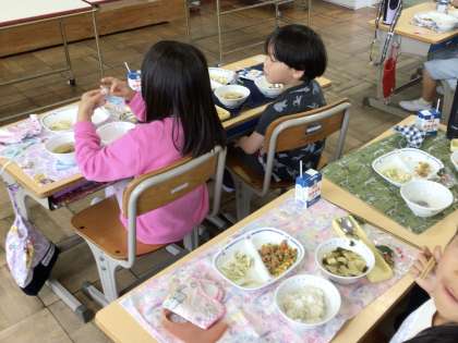 今日の給食はかつおのそぼろ丼、牛乳、ごぼうサラダ、若竹汁、かしわもちの「こどもの日献立」です。