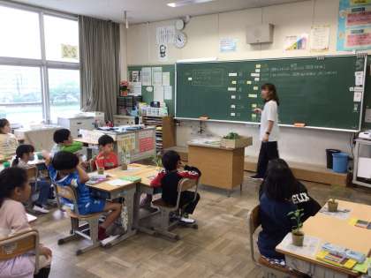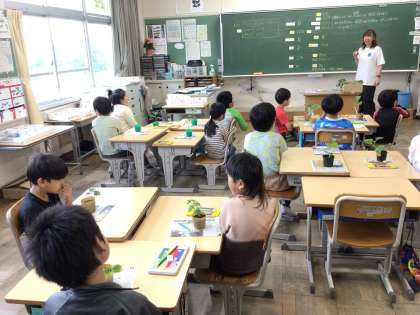2年生の生活科では、自分たちで野菜を育てます。ミニトマト、オクラ、きゅうり、ピーマン、ナス、ゴーヤなどいろいろな種類の苗を植えます。大きく育つように、水やりや観察をしていきます。