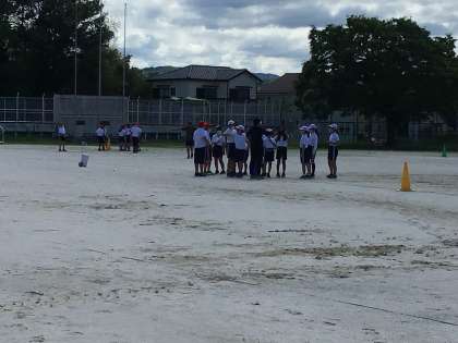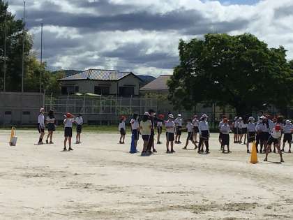 6年生の体育は学年合同で行っています。準備運動の後、バトンパスなど、リレーの練習を頑張っています。